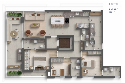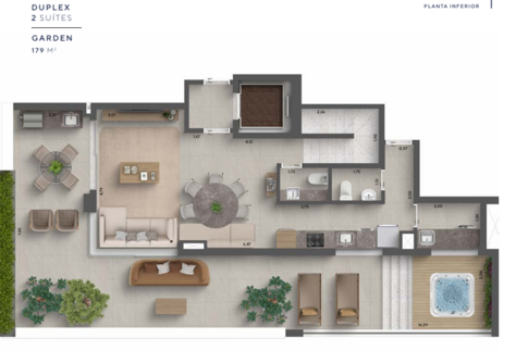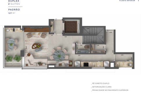 As unidades possuem metragens que variam aproximadamente entre 127 m² e 180 m², com configurações de duas ou três suítes. Os apartamentos duplex contam com terraços amplos, pontos preparados para churrasqueira e, em algumas unidades, spa privativo, além de elevador com parada nos dois pavimentos, o que reforça a sensação de exclusividade e praticidade no dia a dia. Os dormitórios possuem janelas com persianas integradas e os banheiros contam com ventilação natural, reforçando o cuidado do projeto com conforto ambiental.
