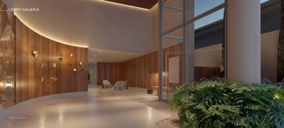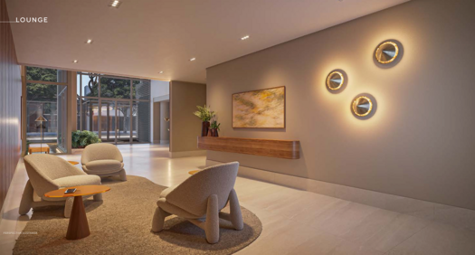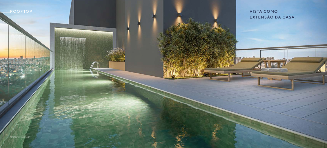 A área comum foi planejada de forma estratégica, distribuindo os espaços entre o térreo e o rooftop do edifício. No pavimento térreo estão ambientes de convivência como lobby com pé-direito duplo, lounge, espaço gourmet, salão de festas, fire lounge, minimarket, pet place e áreas de apoio como espaço delivery e bicicletário. Já na cobertura, o projeto contempla piscina aquecida, solário e academia com vista panorâmica da cidade, criando um ambiente exclusivo de lazer e bem-estar.