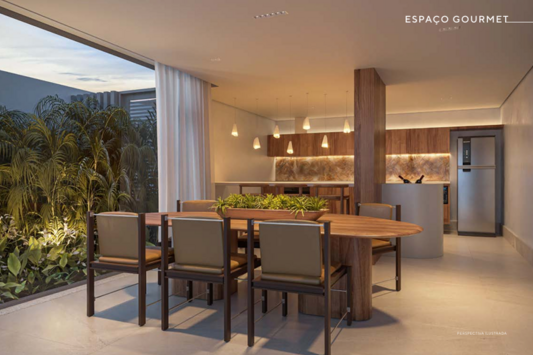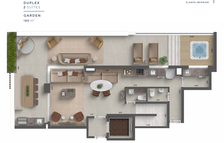 As unidades possuem metragens que variam aproximadamente entre 127 m² e 180 m², com configurações de duas ou três suítes. Os apartamentos duplex contam com terraços amplos, pontos preparados para churrasqueira e, em algumas unidades, spa privativo, além de elevador com parada nos dois pavimentos, o que reforça a sensação de exclusividade e praticidade no dia a dia. Os dormitórios possuem janelas com persianas integradas e os banheiros contam com ventilação natural, reforçando o cuidado do projeto com conforto ambiental.