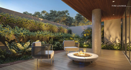 A área comum foi planejada de forma estratégica, distribuindo os espaços entre o térreo e o rooftop do edifício. No pavimento térreo estão ambientes de convivência como lobby com pé-direito duplo, lounge, espaço gourmet, salão de festas, fire lounge, minimarket, pet place e áreas de apoio como espaço delivery e bicicletário. Já na cobertura, o projeto contempla piscina aquecida, solário e academia com vista panorâmica da cidade, criando um ambiente exclusivo de lazer e bem-estar.